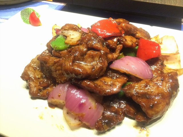 黑椒牛柳,38米。本以为点了一道俗菜,米想到还是很实惠的。肉肉超级大片,青红椒也很清脆,胡椒口味永远最经典,牛肉和黑胡椒必须是真爱啊。肉质鲜嫩,超级下饭的说。缺点也是显而易见的,盘子上全是手印•••