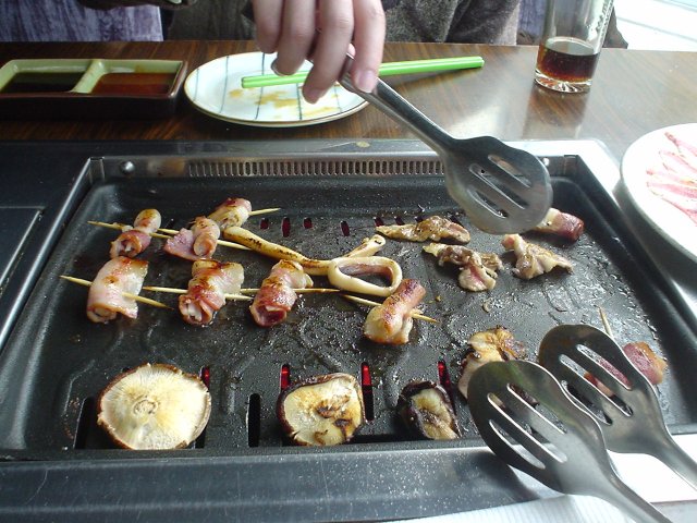 我没有点单,也没有看过菜单,反正大家林林总总点了一大堆东西。服务员主动询问我们需不要把食物都烤好上来。唉,果然啊,我前面就在想呢,现在炉子什么都没有上来,没有烤东西,我已经被油烟熏得来要昏过去了,要是开始烤了我估计就差不多了。估计他们也知道这个问题,是可以把所有需要烧烤的食物都烤好了再送上来的。这个到蛮好,还省了炭火了呢。