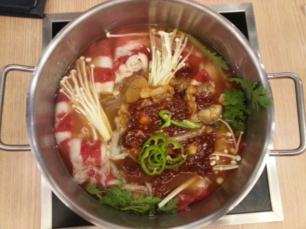 锅里面除了章鱼和牛肉,还有其他的一些蔬菜,胡萝卜,小西葫,青椒和金针菇什么的,越煮越有味道啊,辣辣的特别开胃,服务员会给加水,这个有时候是汤,有时候直接就是水了。