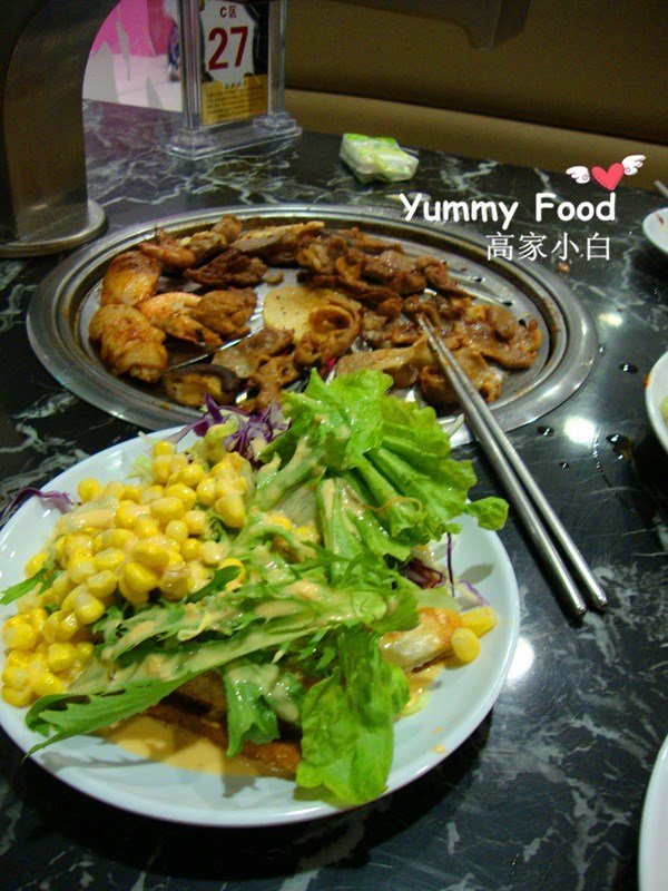 很久之前来过一次,个人感觉环境不错,食材算是新鲜,各种肉类选择应有尽有。提前腌制过的烤鸡翅很嫩,非常入味,吃起来有淡淡的辣味。烤培根和烤五花肉都很肥美,小白喜欢大火集中烤制的方法,这样可以把更多的油脂逼出来,这样一来瘦肉的部分瘦而不柴,肥肥的部分焦香微脆,搭配美味的烧烤蘸酱和大蒜特别提味儿!烤香菇和土豆片也是小白白的最爱,文火慢慢烤熟的土豆锁住了满满的焦香,吃起来脆脆的好像薯片一样哦!这里的肉都是随便自选,个人觉得肉质比较肥美,所以建议勤拿少去,随吃随选避免眼大肚子小才好!吃烤肉一定少不了美味的蔬菜沙拉,完全开放式的选取模式,生菜紫甘蓝苦菊甜玉米搭配美味的千岛酱,爽口又健康,一个人可以吃掉一大盘哦!推荐!