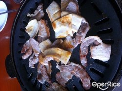 每次去【烤五花肉】是必点滴,30元一份.因为不喜欢油烟味儿,所以都请店家帮忙烤好再端上桌.肉的量不少,虽说是五花肉但瘦肉居多,再加上里面还配有蘑菇片,所以一点都不油腻.烤肉里店家还放了秘制的酱汁,味道特别的好.蘸上烤肉酱,配上蒜瓣和泡菜,再包上生菜,一口下去,超级满足啊~对了,店家还有独门的调料可以蘸烤肉一起吃,这个调料是干料,里面有辣椒粉,孜然,芝麻,好像好有花生碎,吃起来特别的香.这也是别的韩餐厅里没有的额~