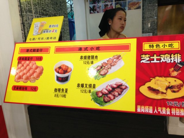 店面不大,门口反复在播放人气美食的节目采访,看着还是不错的,有点香港街边小吃的感觉。看了反复的介绍后,对芝士鸡排有了点兴趣啊!放在我们三个人呢,就各点一份尝尝好了。