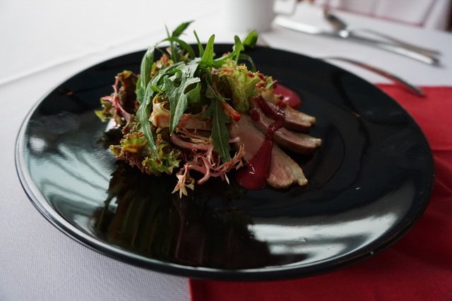 【鸭胸肉色拉】和鳕鱼色拉的区别是鳕鱼替换成了鸭胸肉,上面的酱汁貌似有樱桃的味道。有点酸