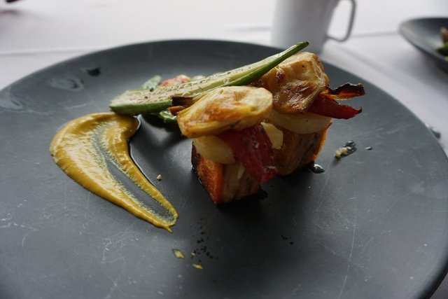 【脆皮乳猪】太没有诚意了。只有2块猪肉。好小的分量。我又开始质疑为啥西餐厅的量那么迷你,老外来吃能吃得饱吗?中国人都觉得量少。猪肉的皮蛮脆。所有主食配的蔬菜都老的要死。一咬都是渣渣头