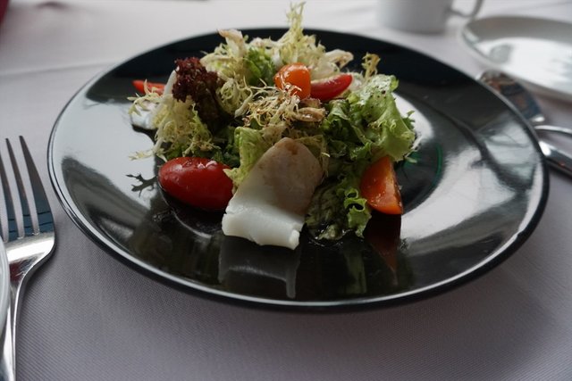 【鳕鱼色拉】腌制的鳕鱼,切片很薄。色拉菜里的醋有点多。