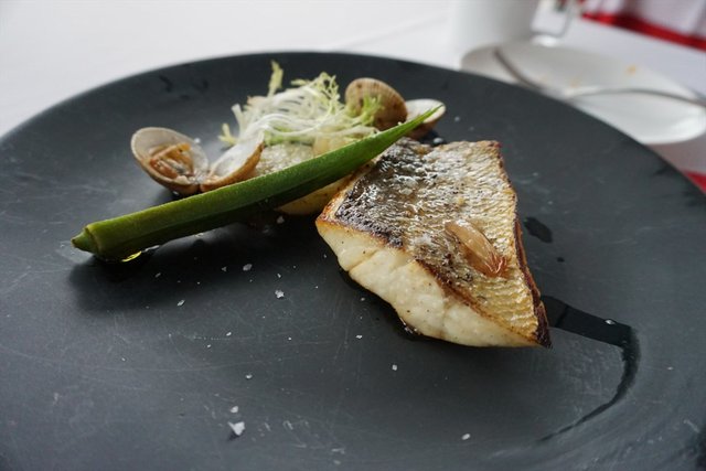 【烤海鲈鱼】这个还不错。鲈鱼表皮擦了盐。味道很鲜美。只是汁水没有烹制到鱼的内部。里面有点偏淡。总体来说还不错