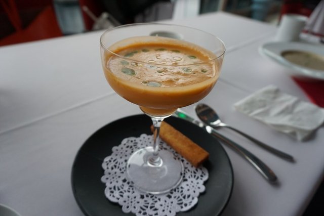 【番茄冷汤】服务生提醒说如果喝不惯冷汤可以替换成热的蘑菇汤。冷汤的味道其实不错。还配有一根面包干可以沾着吃