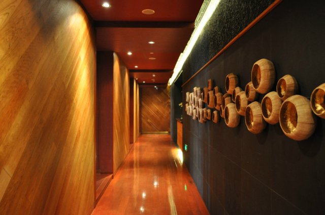 有十五间包房。我们所在的包房用深浅不一的木色烘托出层次,有些老上海的风情。
