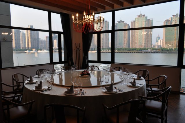 圆桌宽大,桌椅古朴,窗外是美丽的浦江风景,外设小阳台。