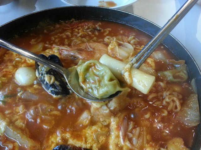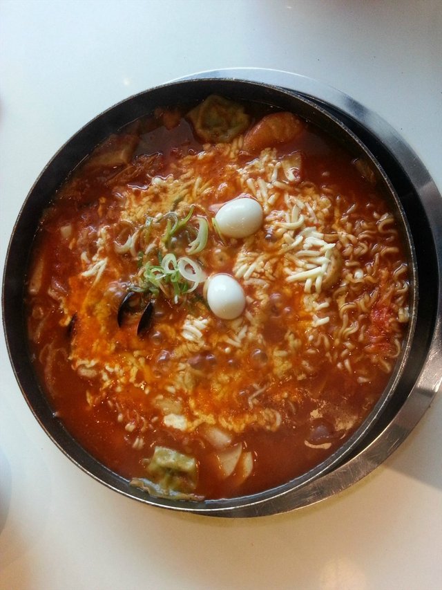 网上评价很高,周五晚上七点到的,排了好长的队,给了等号排238号,天啊,前面有37个等位。等了20分钟后果断离开,打算第二天开门就来。第二天10点半到的,哇噻,店里已经坐了一半的人了。服务很热情,没有因为生意好而怠慢顾客。等了大概七八分钟就上餐了。本就想凑个热闹的,没来之前心想不就是韩国方便面嘛,能好吃到哪去呢,真是不吃不知道啊,太毕了!要的芝士海鲜的,芝士浓郁,口口留香。海鲜鲜美,美味无比。里面的年糕很筋道,还有带馅的,软糯香甜,最爱吃紫薯味的。韩国炒饭太香了,紫菜和玉米完美搭配,香,香,香!吃到一半时,整个店里已经坐满了人了,真是人气爆棚啊!好吃,真心好吃!