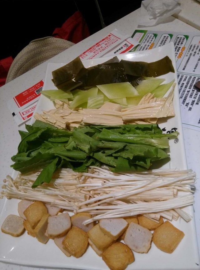 配菜选了个群英荟萃,有鱼豆腐、笋片、海带、油麦菜,油麦菜基本上没吃,鱼豆腐味道不错,鲜鲜的,笋片也是脆脆的