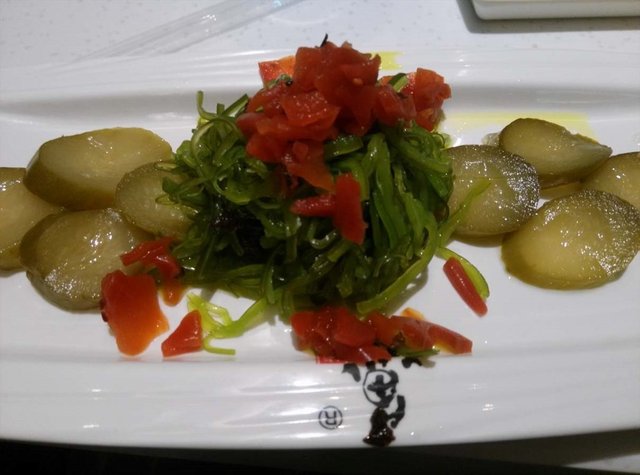 凉菜选的是中华海藻,哏啾啾的,比较爽口,上面还放了几片酸黄瓜,真酸啊……