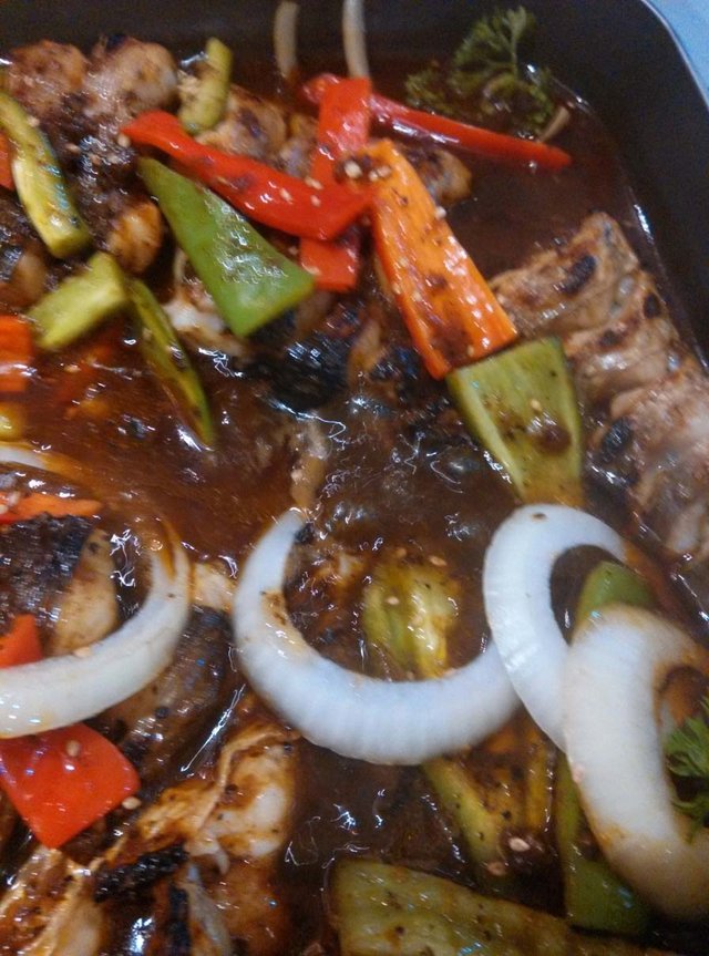 大概等了10几分钟的样子,鱼就上来了,2斤6两的清江鱼,端上来之后是用电热锅继续加热的,热得比较快,时不时就糊了,所以一直要求加汤来着,清江鱼口感细腻,肉质爽滑,而且刺儿少,基本上就中间一根大骨头,偶尔有小刺儿也是比较硬的那种,很容易吃出来,不怕被卡到,喜欢吃鱼皮的尤其要选清江鱼,我们选的是黑胡椒味儿的,这个有点重,都有点呛嗓子,感觉像是辣辣的……