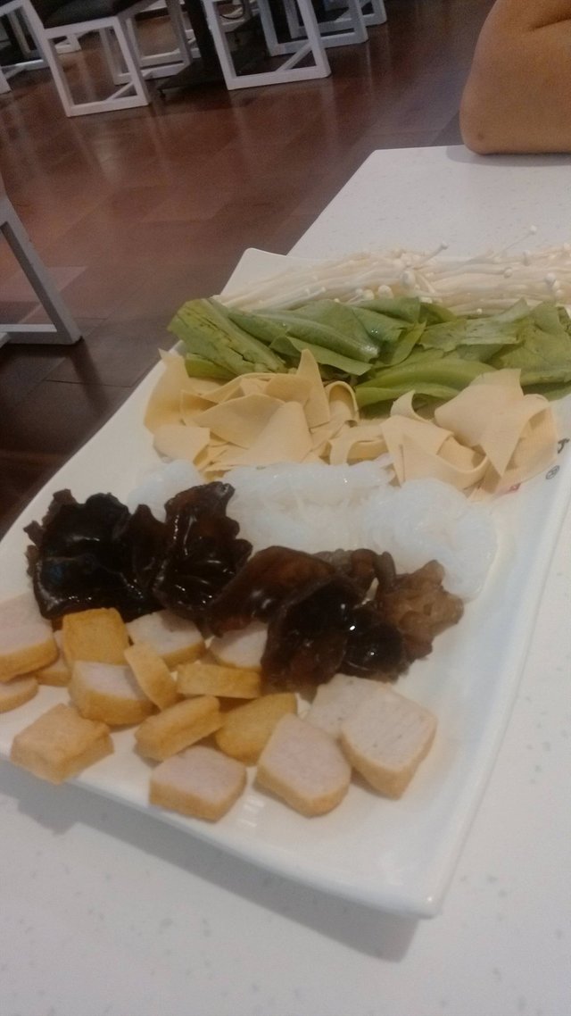 配菜的话可以单点也有拼盘,我个人是比较喜欢拼盘的,名字很好听,叫什么花枝招展的,而且种类也比较多,我选的那款配菜里就包括了鱼豆腐,魔芋,干豆腐,木耳,小白菜还有金针菇,一份是18块钱左右,看起来量不是很大,但是下到锅里也不算少了。