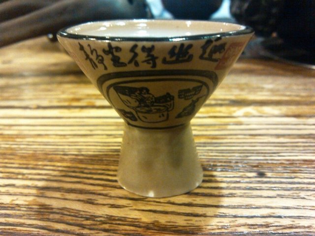 从装饰到餐具也都很有趣,桌上作为隔栏的小饰物、深色木制纸巾盒、类石的小碗喝粗瓷小酒盅都透露着几分江湖的气息。只是小碗因为磕碰而造成的边缘破损太多了,有些影响档次。