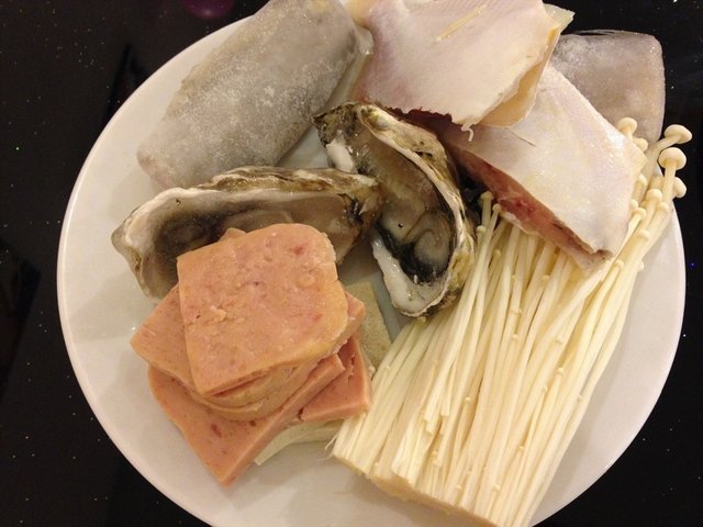 看团购上面介绍有虾的,但是去的时候没有看到的。只有生蚝冷冻过的,还有鲳鱼。肥肠有的。菇类剩的还有一些。我基本是一样选了一点。但是感觉没有肉肉吸引人的。菜品都好像没有人来添加的,生意太好了。人暴多。