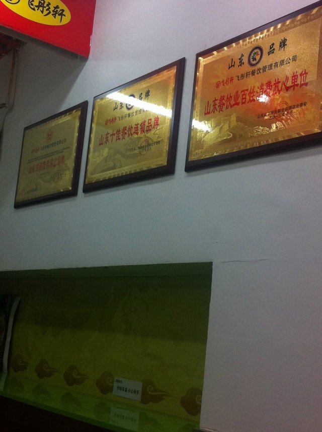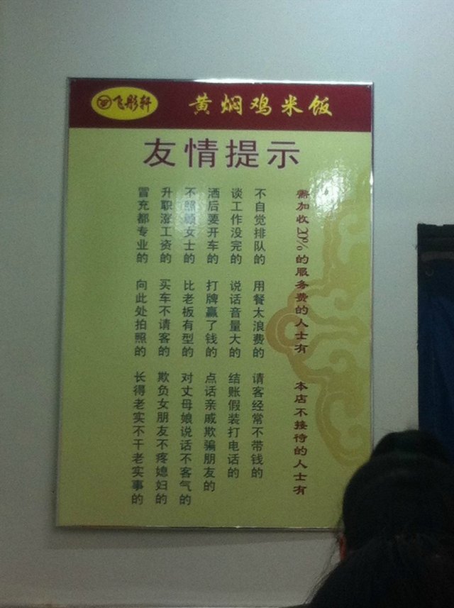 但俩者组成的这一顿饭可真是干巴啊。我慢慢的干嚼着还是会有些噎得慌。东北人大部分可能都是吃不惯的,看了墙上的招牌和介绍才知道,原来真的是南方传过来的。而且有很多荣誉牌匾在墙上赫然醒目。最逗的还是友情提示的顺口溜,呵呵。