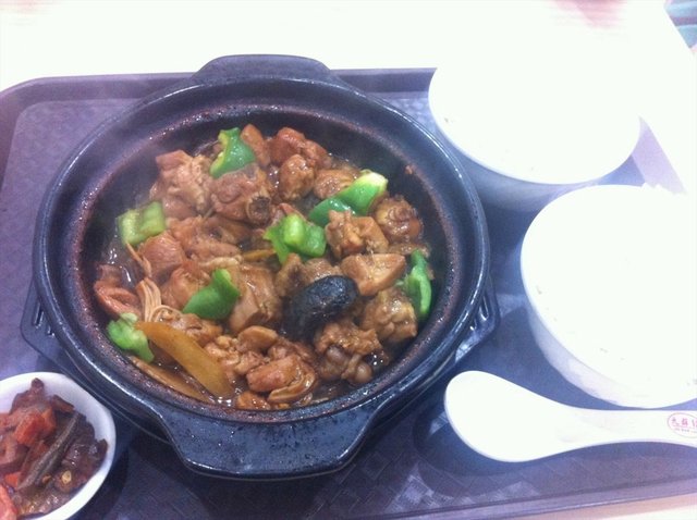 端上来我都傻了,因为和我料想的不一样,我以为是一个砂锅里面是鸡肉和米饭,谁知竟是鸡肉一份、米饭一份,分开的,在米饭中有些小米,鸡肉是焖出来的,所以叫黄~焖鸡米饭,好吧,尝尝。