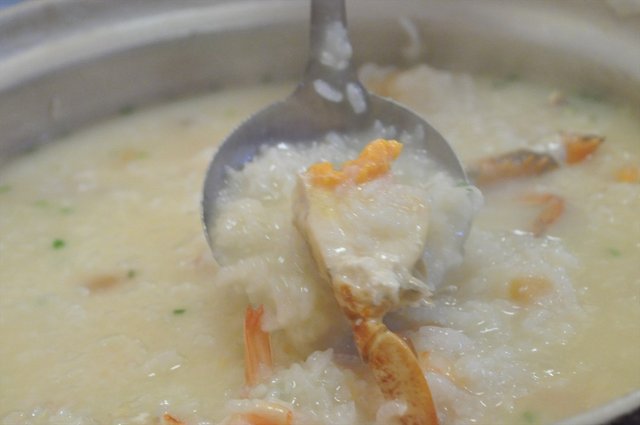 好大的一盆,里面还加了基围虾和干贝。粥炖得非常软糯粘稠,味道鲜得可以掉眉毛了。