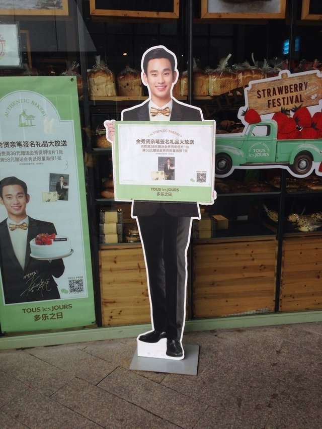 一家韩国连锁的面包店,借着韩剧的流行进入了中国,再加上都敏俊XI的走红,更是吸引了不少MM去买啊。龙猫面包造型好可爱,我也是听同事介绍去买的,可惜第一次去的时候卖完了,想要买的MM可要早点去哦。8元一个的价格不贵,但真的蛮小的,几口就没有了,面包蛮香的,里面还有奶油哦。如果有缘还有这款面包,推荐尝一下哦,下次我还要去尝试一下其他的面包。门口金秀贤的人立牌很显眼,有MM忍不住上去合影的