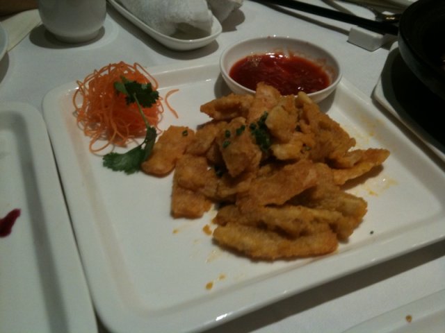 干炸黄鱼响铃:好次的,外面是脆脆的豆腐皮,里面是黄鱼。建议大家一上桌不要以口头,因为它外面温度正好,里面还是蛮烫的,bf就被烫了下(小样,谁叫你吃那么快)