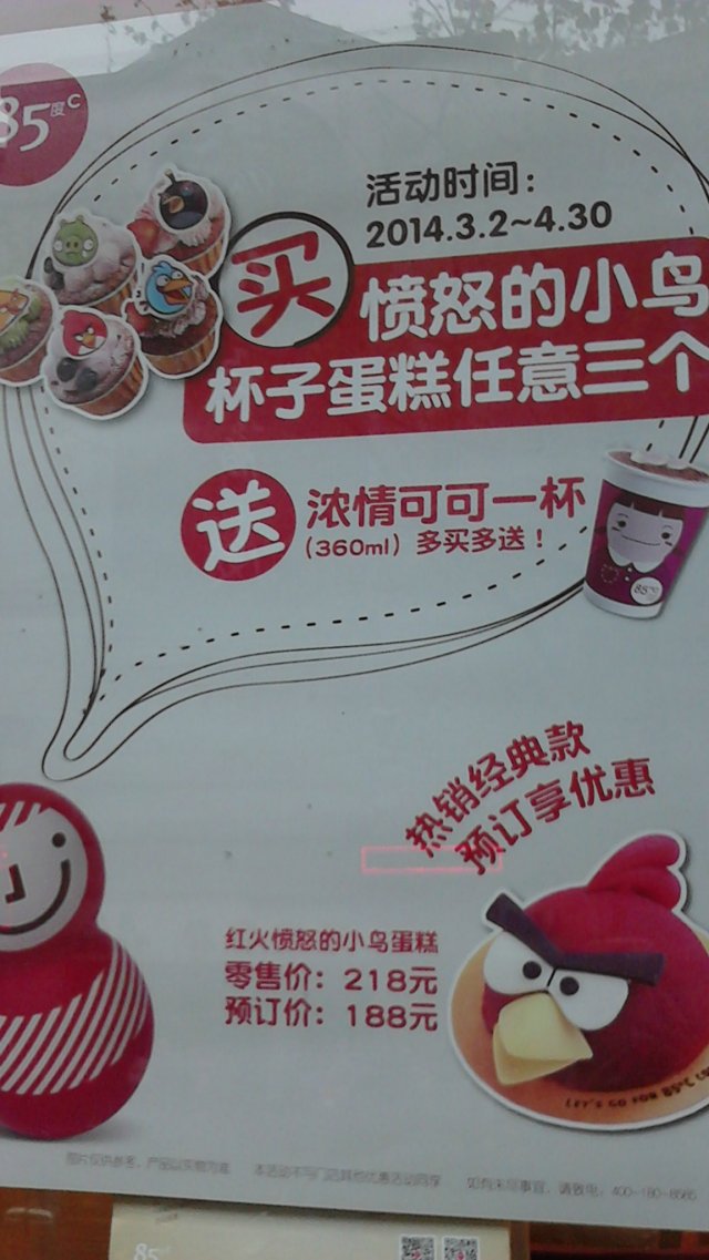 85度C现在有推出愤怒的小鸟系列蛋糕,做的好可爱。愤怒的小鸟杯子蛋糕每个12元。现在买3个还送浓情可可一杯(360ml)。那个红火愤怒的小鸟大蛋糕要218元,现在预订价是188元,还挺可爱的,送给小朋友,肯定大受欢迎。