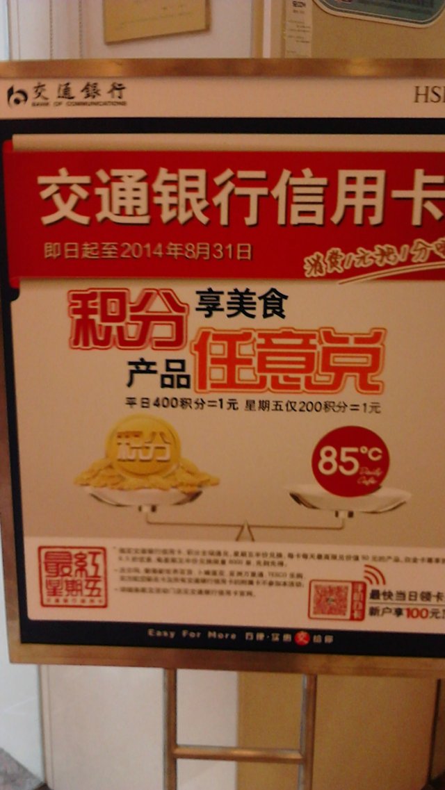 说动交通银行积分兑换,在14年8月31日前,平日每400积分=1元,仅周五200积分=1元。这个活动具体细节我也拍了照片,大家看图片,有图有真相。