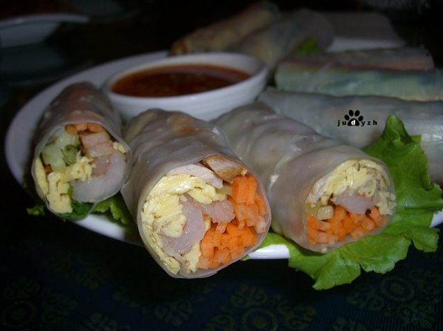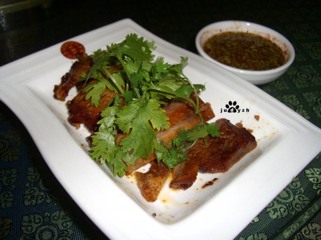 餐盘十分精美,想必也是来自于泰国吧?这可是店家的招牌菜呢,由香茅和南姜作配料,将柠檬、椰糖和小米椒等调汁,淋在鲈鱼上,最后加上芹菜、萝卜丝等加以点缀。待酒精炉加热一会儿后更加入味。这可是正宗的泰国料理呢,不过大家貌似不大吃的惯。
