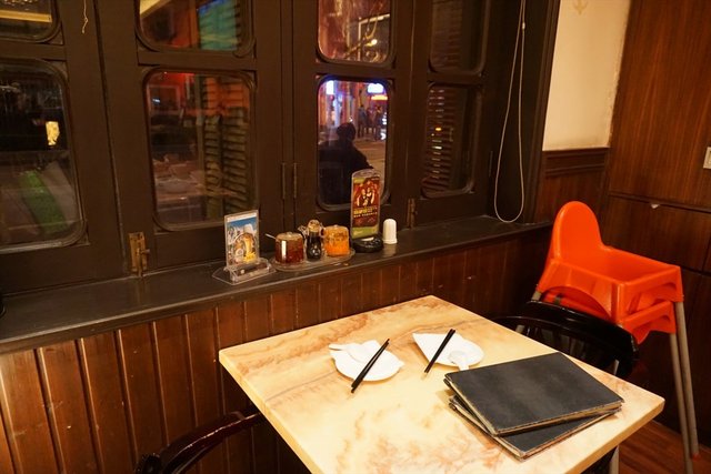 这家店开了那么多年,装修在现在看来也不算太寒甚。大部分的新加坡餐厅都有路边摊和tvb茶餐厅那样破旧随意的风格。这里还有大吊灯的小心思。比较有趣的是,定位给我留的那个窗口位,背后看起来是个大厨柜,其实是隔离用餐区和厨房的屏障物。服务生就把厨柜一开,把要洗的碗筷都从这个厨柜的门塞进去