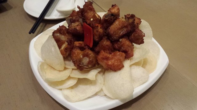 冲着陈皮骨去的,考拉是很不喜欢陈皮入菜入甜品的人,看到大家都对他们家的陈皮骨赞许有加,抱着一定希望去的...可是最终还是失望而归,偏甜了,排骨倒是炸得一个松脆,只是不喜欢味道~下面的龙虾片还不错。