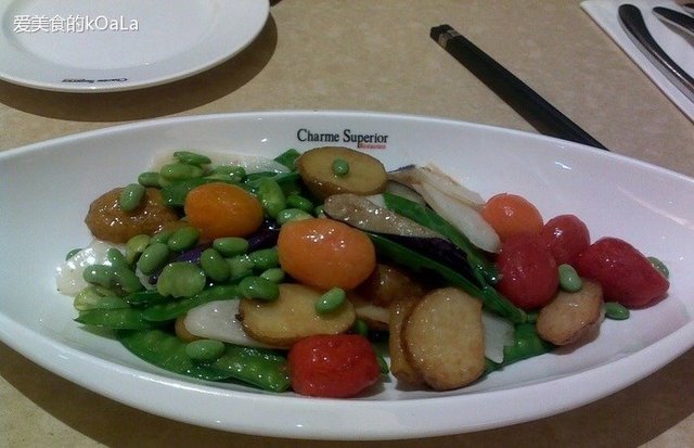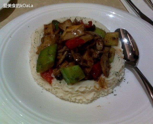 也蛮漂亮的一道菜,中间是翠瓜野菌用黑胡椒炒在一起,周围围着一圈土豆泥,像是蛋糕的围边,吃上去辣辣的~但是!它竟然是温的,而且偏向于是冷掉的,完全没口感~差!