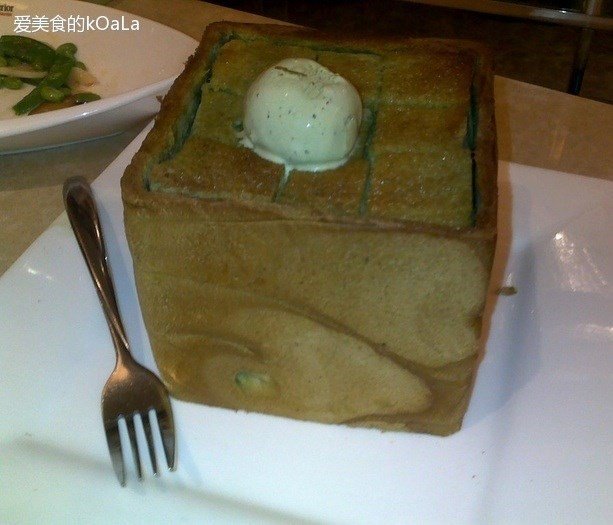所谓幻彩就是有好几种口味~我不喜欢草莓,姐姐不喜欢巧克力,那只剩下香草和抹茶的了,香草吃多了,毋庸置疑地选择了抹茶,这是个正确的决定!很好吃~整个厚多士就是抹茶味的,再配上一个抹茶味的冰激凌球,赞~但我觉得如果是抹茶味的厚多士配一个香草的冰激凌球应该会更好吃吧~