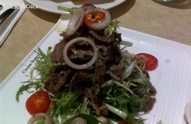 片状的雪花牛肉和蔬菜拌在一起,不是很重的酸辣味比较清口~牛肉味不错,肉质属于有嚼头的那种,作为冷菜还不错。