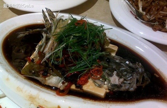 有好几种鱼不过只有桂鱼是我能吃的,海鲜过敏的娃真是伤不起啊~腌过的青椒和红椒,味道很不错哦~鱼挺新鲜的,蒸鱼的酱油咸度刚好,火候也到位了,上面铺满了豆豉和青葱,红的绿的黑的,漂亮!就是贵了点