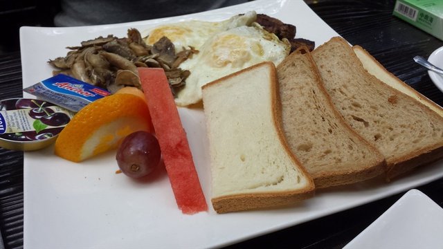 就没吃过这么难吃的Omelet,这哪是Omelet啊?就是一张被煎过头的蛋饼,干得像在嚼发泡胶,欲哭无泪啊!吐司也没烤过,水果就那么一点点,考拉完全没吃饱~
