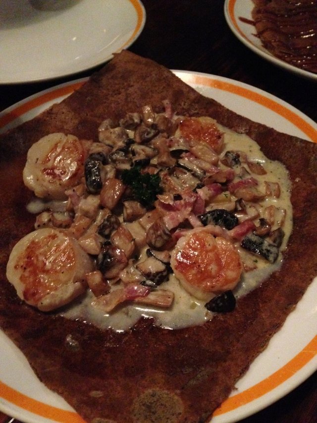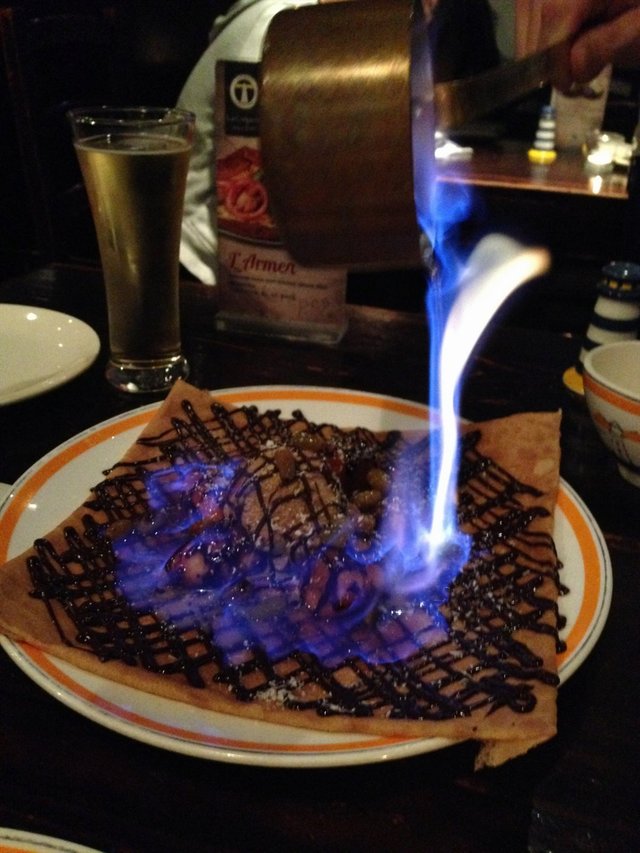 薄饼点了两个,一个是大家都主推的火焰薄饼,上来的时候是挺炫的,火一点,烧得很高,烧了很久。但是味道是甜饼,我觉得没有后来点的那个鲜贝口感好。说是薄饼,真的很薄,而且很软,上面基本都是浇了巧克力酱,甜味的放冰激凌,鲜贝的那个还放了培根,切开薄饼之后就可以吧料全包起来吃了。