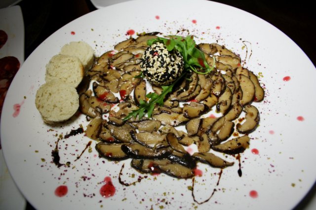 蘑菇薄片,摆盘类似一朵盛开的花朵,中间一个圆形的芝麻球,直觉就告诉我,球里一定有东西,果然,居然是鹅肝哦,而且是冰冰的鹅肝,入口有点冰激凌融化的味道,有芝麻的包裹不但能够锁住温度,还能提高香味,和蘑菇,面包混合在一起食用很好吃~~