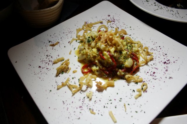 鳕鱼炒鸡蛋,极力推荐一下,众所周知,鸡蛋是百搭的食物,但和鳕鱼组合在一起还是第一回品尝,口感很细腻,带点奶油味,还有几分甜味,厨师的点睛之笔在于在这道菜里加入了脆脆的东西(目前还没悟到是什么食材),品尝起来很有节凑感,又松软又香脆,喜欢~