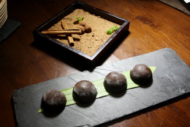 甜品是创意巧克力,是一个方盒子+四块巧克力,像打开了潘多拉的盒子一般新奇,令人意外的是4块巧克力外表一样,内部居然是不同口味的,有甜果酱的,蔓越莓酱的,还有橙子口味的....看你手气挑选,让我联想了阿甘正传里的那句名言,人生就像巧克力,你永远不知道下一颗是什么味道~