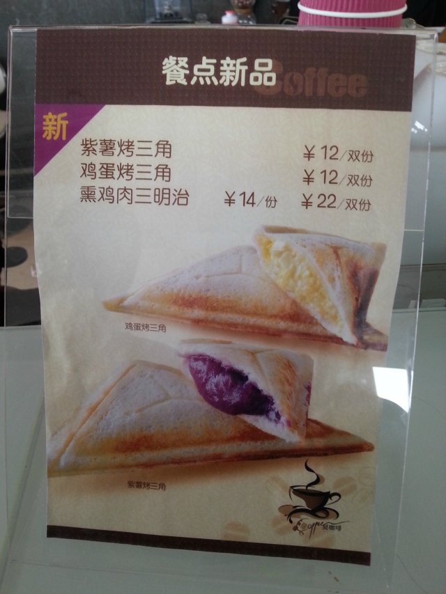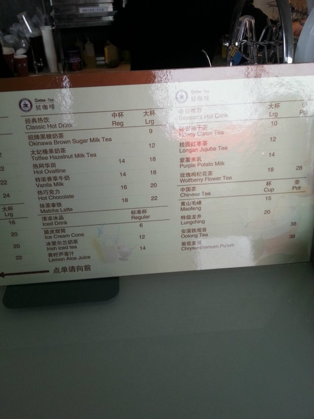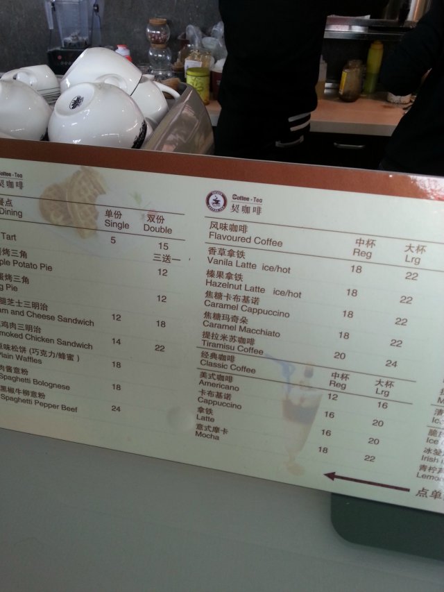 收银台上面有一块很大的价格牌,你可以很清楚的看到食品的价格哦,而且他们家的饮料很多哦,还有茶类哦,当然,最经典的还是咖啡和奶茶啦~经常会有新品哦,喜欢的可以经常尝尝不同的味道呀~