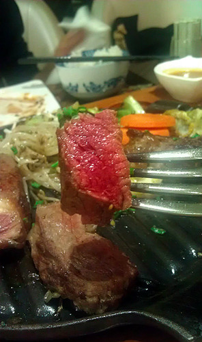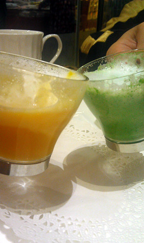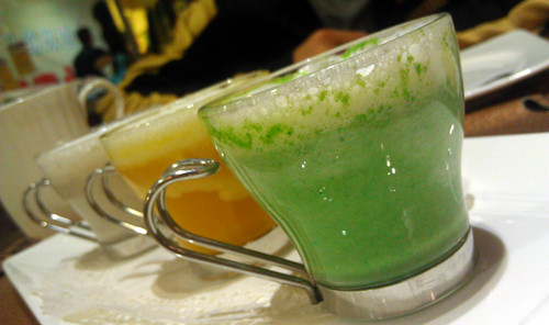 Pokka coffee candy85623等级42013-04-1067 浏览 关注 心心念了很久,终于决定去试试。有招行卡,周三可以5选2款5折(白金卡优惠更多)。要了一份牛扒,一份卡布奇诺三重奏汤,一份黑松露菌PIZZA, 一份绿茶提拉米苏。牛扒因为之前看了DP,有人说要了8成熟结果变成全熟,为了避免这种情况,服务员再煎的时候我选择了7成熟,结果!上来变成了血淋淋的牛扒~看到我都吓一跳!话说,出品也不太稳定了~牛扒肉很嫩,但因为带太多血的关系,每块我还是放在铁板上用铁板的余温再煎一煎。配菜很多,尤其喜欢豆芽,炒的很香。黑松露菌PIZZA的菌味很浓郁,配上一片片大大的芝士片,口感不错,而且饼底很薄,两人SHARE刚刚好。卡布奇诺三重奏汤是菠菜汤+南瓜汤+鲜菌汤。南瓜汤一般,不如汉拿山的好,菠菜汤还OK,有菠菜味道,推荐鲜菌汤,我本身就爱忌廉蘑菇汤的味道,这款汤是忌廉蘑菇汤的基础上加上了打碎的蘑菇蓉口感,蘑菇浓郁啦~~绿茶提拉米苏,红豆蓉很细腻且不甜,提拉米苏CREAM有淡淡的绿茶味道,整体口感不错!他家环境一般,服务员比较醒目,人不多。坐在窗边有点像动物园里的动物被观赏的感觉~ 以上食记乃用户个人意见 , 并不代表OpenRice之观点。赞好分享Pokka coffee 珀卡咖啡 https://s.openrice.com/KtLT0W0D0u500检举 张贴 评分4味道3环境3服务3卫生2抵食