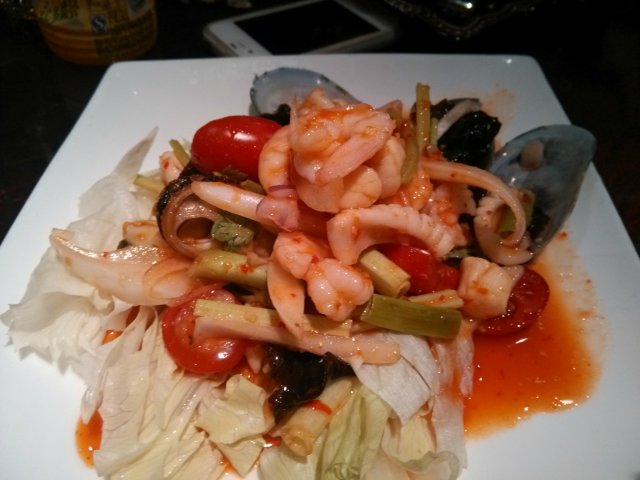 用料有贝类、鱿鱼、虾仁、香芹、小番茄~酸辣的口味,很开胃~