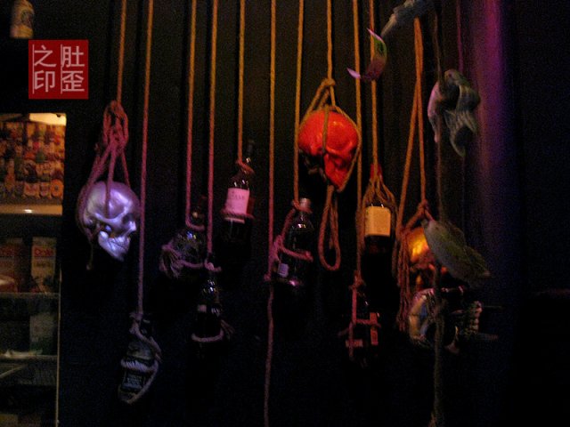 我点的另一款骷髅头鸡尾酒狼人之血,造型很华丽,骷髅头吊在钩子上晃晃悠悠。鸡尾酒是普通的雪碧兑伏特加,酒精度超低,味道非常像饮料,喝的时候从脑壳开口处插一根吸管进去,感觉自己像变态的巫婆在嘬脑髓,蛮诡异的。