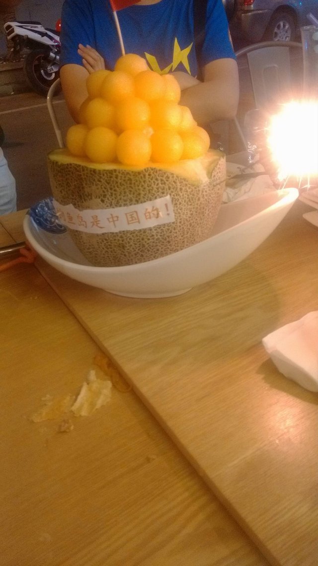 最后有两道菜一个叫加乐比宝藏,就是一个大面包里面放的各式海鲜,另外一个叫保卫钓鱼岛,应该算是一个甜品吧,外皮是哈蜜瓜。
