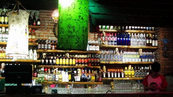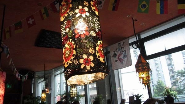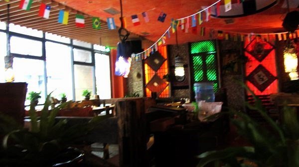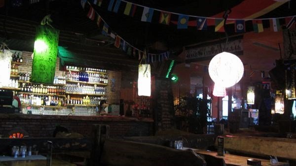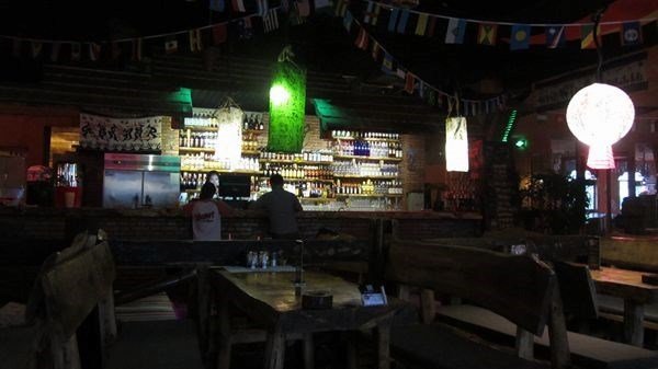 进门后感觉整个酒吧呈现出一种很自然很狂野的装修风格,随意搭配的车轮、原木桌椅、木条、马灯、涂鸦墙、各种麻布等等,混乱搭配在一起却又很自然很和谐