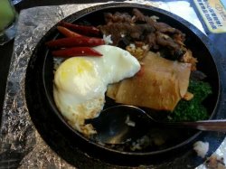 来新天地肯定会来吃这里的石锅饭,石锅饭很特别,但是一锅端上来很重很烫手,而且要等好久才能上来,上来的第一件事就是先把下面的饭翻一下,不然就有粘着锅了。里面的肉分量还行吧,鸡蛋里面还没有熟肉的,饭菜吃起来酸酸辣辣的,口感不错。…查看更多