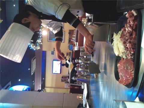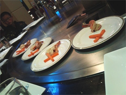 地点容易搵,入边得4张大铁板台,每台由一个厨师包办。我哋要咗个双人套餐,人均100左右啦。最先上既蒸蛋,上面撒D黑色既,话喺鱼子喔,有D腥,唔喺几好吃。之后肥牛金针卷,金针菇现炒,肥牛又喺现煎,再卷埋一齐,好好味!!跟住喺大明虾一只,个头真喺好大,肉质弹牙,而且只虾已经帮你开晒边,啖啖肉,正!跟住就系一口一粒既牛仔肉,讲真,有D韧,不怎么好吃,后尾吃咗鸡肉,嫩好多~之后,炒野菜,炒饭,无咩好吃既。又唔喺话好特别~最尾,炸香蕉配草莓雪糕砖做甜品,厨师撒咗D酒,哇,即时火光红红!刺激~香蕉外脆内软,都可以。…查看更多