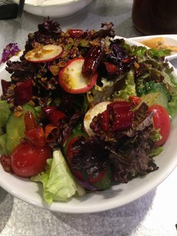 川味观自然是吃四川香辣口味的东西,为了弄点不辣的,选了这个拌杂菜,一个大碗上来的,里面的菜是挺杂的,紫甘蓝、黄瓜,圣女果,生菜、苹果等等,糖醋凉拌的,问题是还加了干辣椒和红油,依然是辣啊!…查看更多