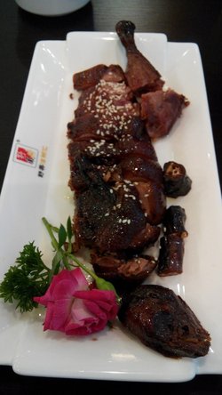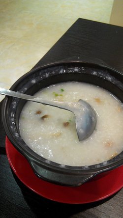 团购的双人餐,总体感觉很不错,完全没有区别对待,店员服务很热情很贴心,整体用餐环境也不错,大厅很明亮。粥是4选1,因为想吃咸的,店员推荐的山珍排骨粥和大脚菌鸡丝粥,后来选的山珍排骨粥,因为店员说里面菌的种类更丰富一些。上来之后发现口感很不错,里面内涵也比较丰富,菌丝菌片都有,排骨是切细了的,这样应该更适合煮粥吧?太湖酱野鸭,其实就是板鸭的口感了,咸鲜咸鲜的,蛮有嚼劲,很适合下稀饭吃,我和我爸都很喜欢。白灵菇熘鸡丝,这个菜算偏清淡口味的,我挺喜欢的,那个白灵菇?是切成丝状的,口感很好,和鸡丝一起很搭哦,这盘我们是统统消灭了的。葱香薄饼,这个很好吃,要趁热吃,脆脆的薄饼,就着稀饭一起,很美味。油麦菜,就是清炒莴笋叶子啦,这个菜无功无过,不过因为是整个套餐里面唯一的绿色蔬菜,我还是消灭了一大半,可以解解油腻。PS,最后因为菜品太丰富,那个酱香鸭还剩得蛮多的就打包了,店员还给了打包盒,没有收费哦。吃的很尽心,下次还会再去的。…查看更多