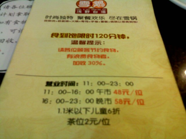 火窝+铁板烧+炒雪糕+寿司自助餐 浅野台湾雪锅 2011-02-23地点:万国广场6楼价钱:午餐48元/位 晚餐58元/位 茶位2元/位品种:雪糕..火锅..烧烤..寿司..窝底:不用另加收费用。自助式:左火窝右铁板炉服务:很好,速度快。推荐:肥牛,黑椒牛肉,墨鱼丸酱料:烤肉酱,秘制酱油。用餐时间:我是5点去的,所以不多人。限时用餐:这家店有个限时用餐,120分钟,虽然限了时,但还没到时间就已经拼命吃到很饱了,所以不用担心时间不够,时间足已。对比大四川的评价:大四川55元/位,窝底要另加费用,都要等位麻烦。而且他的出品不新鲜,肥牛也是限拿,有时食品不够,补存也很慢,饮料不好喝,汽水没汽,奶茶,西瓜汁那些都不好喝。服务态度差推荐原因:喜欢他这里的东西都好新鲜..口感都很好..汽水是支装的.肉类跟海鲜是单点的,肥牛等全部食品不限份量,上菜也快..…查看更多以上食记乃用户个人意见 , 并不代表OpenRice之观点。赞好分享火窝+铁板烧+炒雪糕+寿司自助餐 浅野台湾雪锅 https://s.openrice.com/KtLT0m0JcW000检举 张贴 评分5味道5环境5服务5卫生5抵食推介美食左火窝右铁板炉餐牌价钱牌铁板烧黑椒牛排,肥牛用餐日期2011-02-18人均消费¥60 (晚餐)